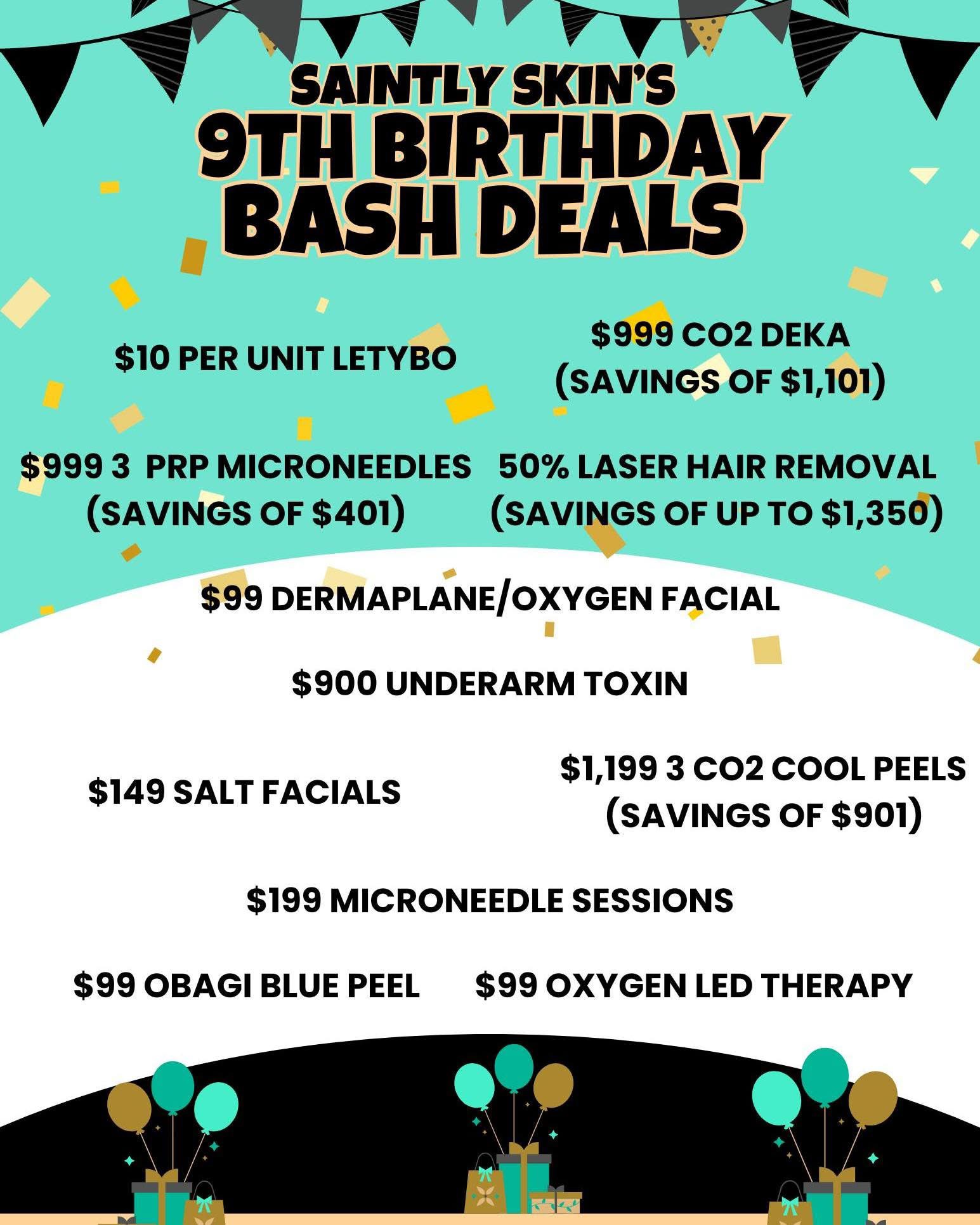 Discover Saintly Skin’s 9th Birthday Bash Deals. Valid until October 31st. Book now and save!